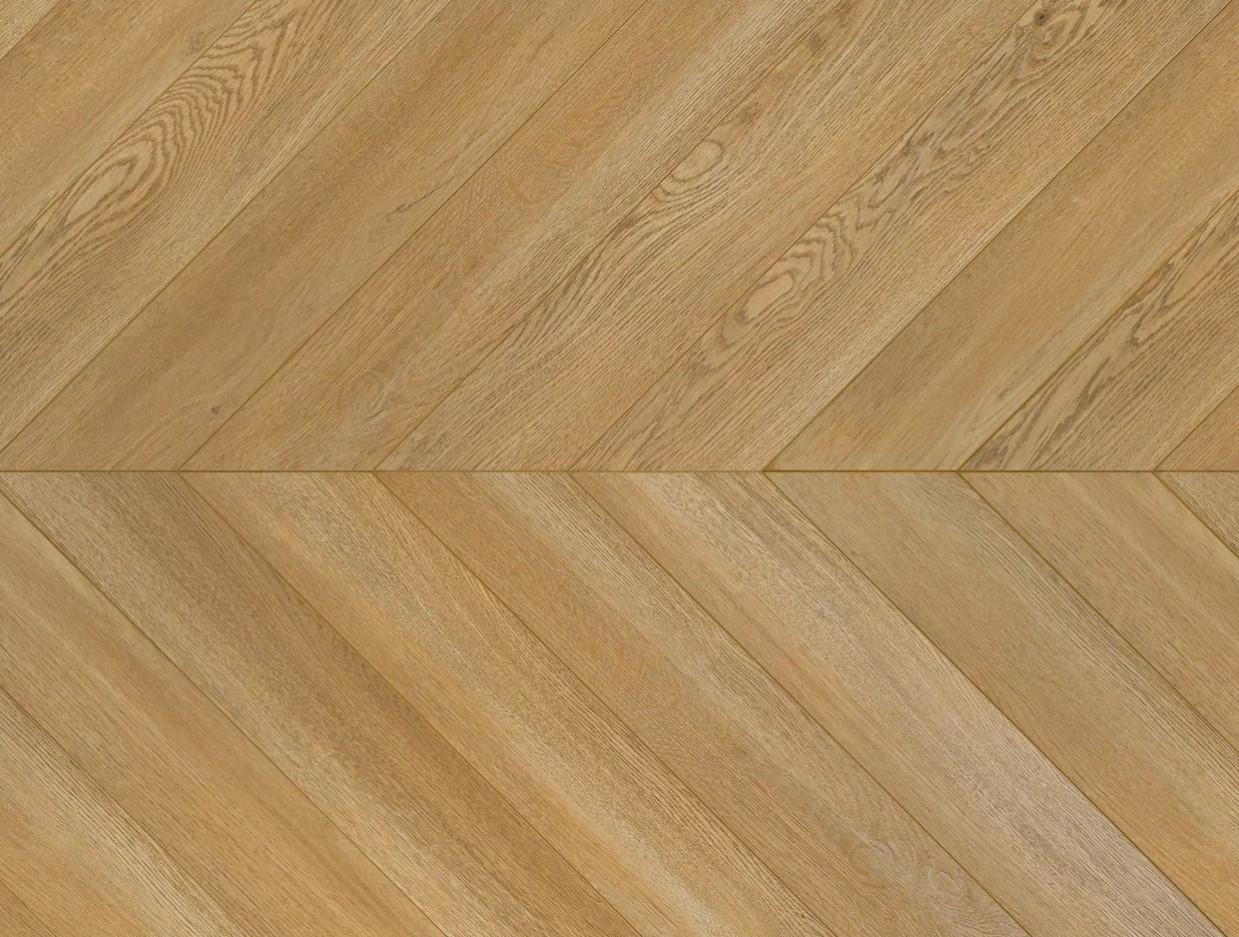 1. Французская ёлка, также известная как «Chevron», представляет собой укладку, при которой доски срезаются под углом, обычно 45 или 60 градусов, и укладываются встык, образуя непрерывный V-образный узор. Это создаёт эффект динамичности и добавляет пространству глубины. Доски имеют трапециевидную форму с косыми срезами. Благодаря этому при укладке образуется узор, напоминающий еловые ветки.